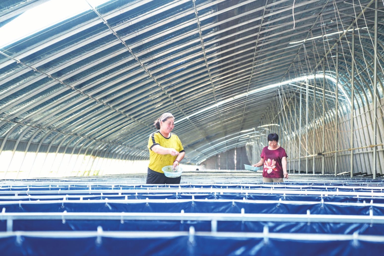 工人在水蛭養(yǎng)殖基地投放餌料