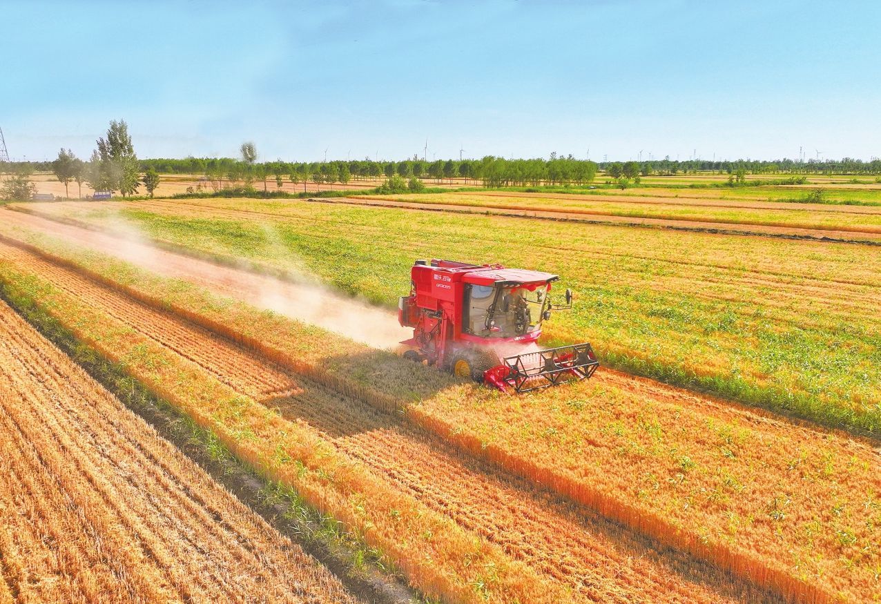 經(jīng)過改良的鹽堿地里,村民在收割小麥