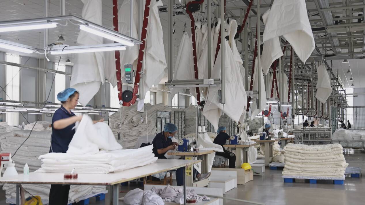 而博物館外的現(xiàn)實圖景,正書寫著紡織產(chǎn)業(yè)的新傳奇。在山東鑫瑞娜家紡股份有限公司現(xiàn)代化的紡織園區(qū)內(nèi),智能化吊掛流水線高速運轉,依托自主研發(fā)的3S純棉舒化技術及省級智能制造場景認證,實現(xiàn)了“原料-半成品-成品”的全流程數(shù)字化管控,300余臺套先進設備,覆蓋棉花梳理、鋪網(wǎng)、裝套、絎縫、檢針、滅菌等全流程,支持年產(chǎn)可達100萬套中高端純棉床品的高效生產(chǎn)。