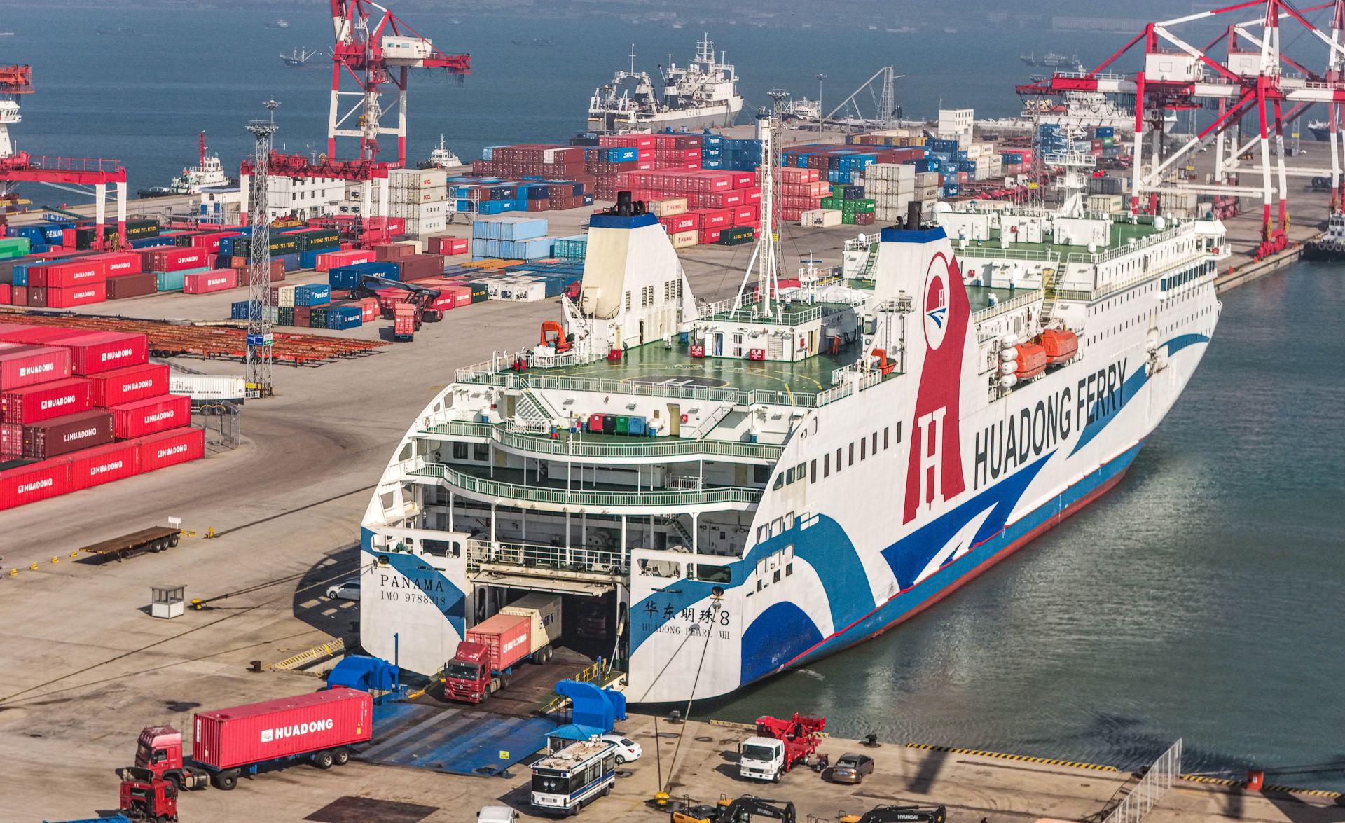 11月1日,山東省榮成市石島管理區(qū)石島新港口岸,外籍客貨滾裝船在裝卸貨物(無人機(jī)照片)。