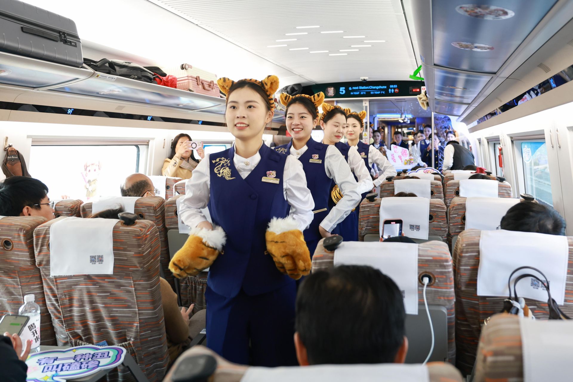11月5日,G902次“萌虎”主題列車工作人員在車廂內(nèi)為旅客表演“萌虎”韻律操。