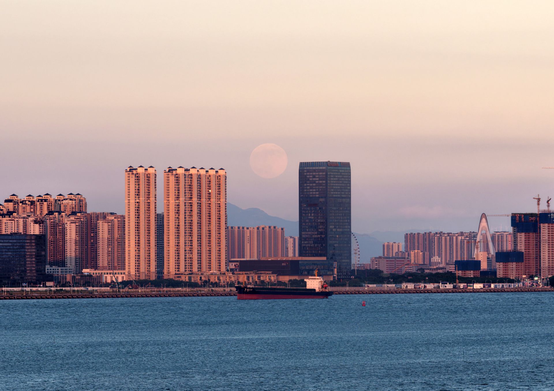 11月5日傍晚在廣東汕頭南濱路拍攝的“超級月亮”(無人機(jī)照片)。