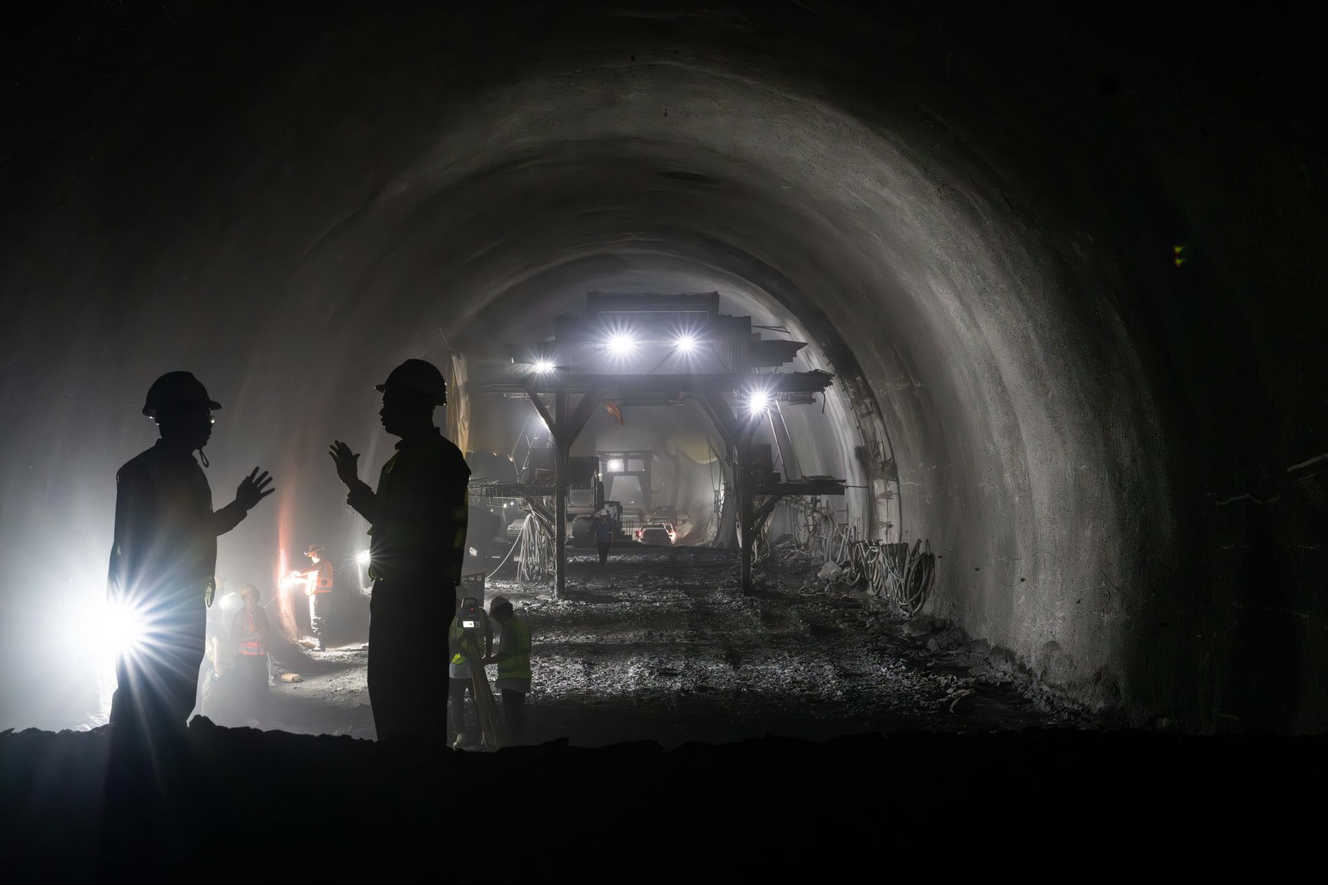 11月6日,參建人員在渝昆高鐵彝良隧道右線內交流。