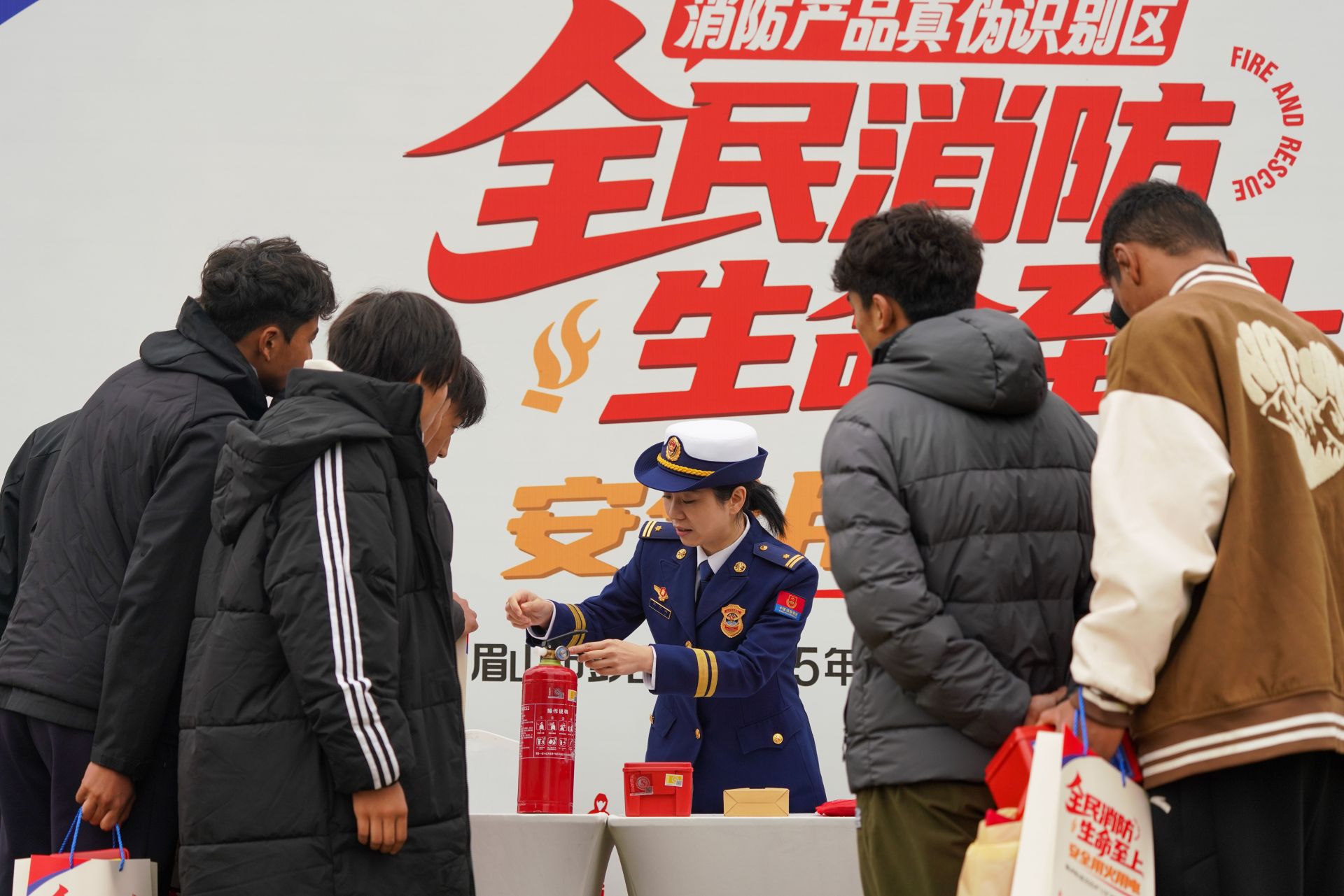 11月6日,在四川省眉山市彭山區(qū)2025年“119”消防宣傳月啟動儀式現(xiàn)場,消防隊員為市民講解消防知識。