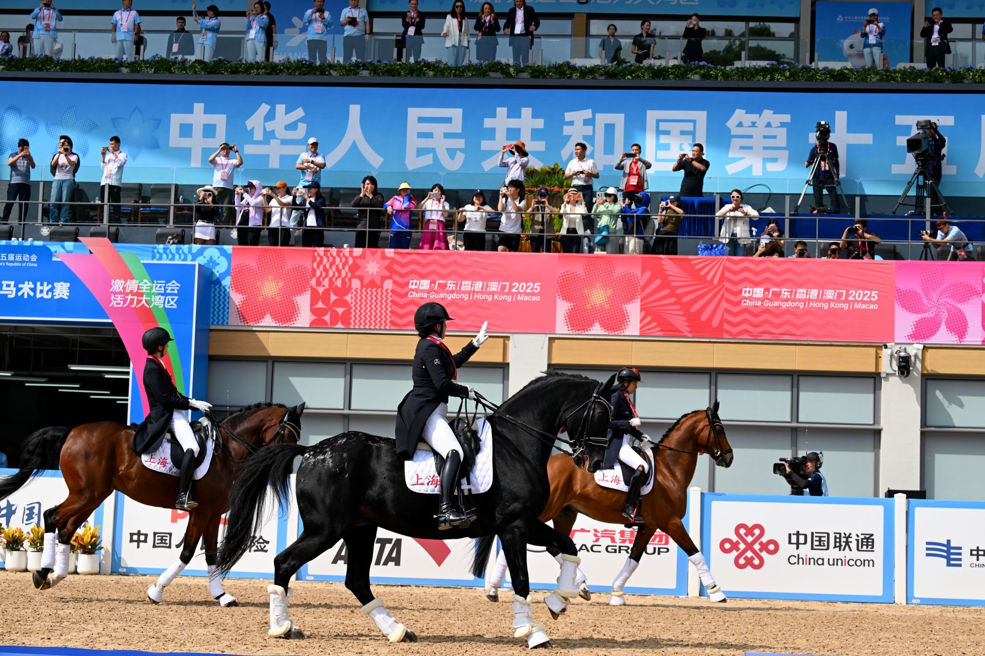 當(dāng)日,第十五屆全國運(yùn)動會馬術(shù)比賽盛裝舞步團(tuán)體決賽及個人資格賽在深圳舉行。