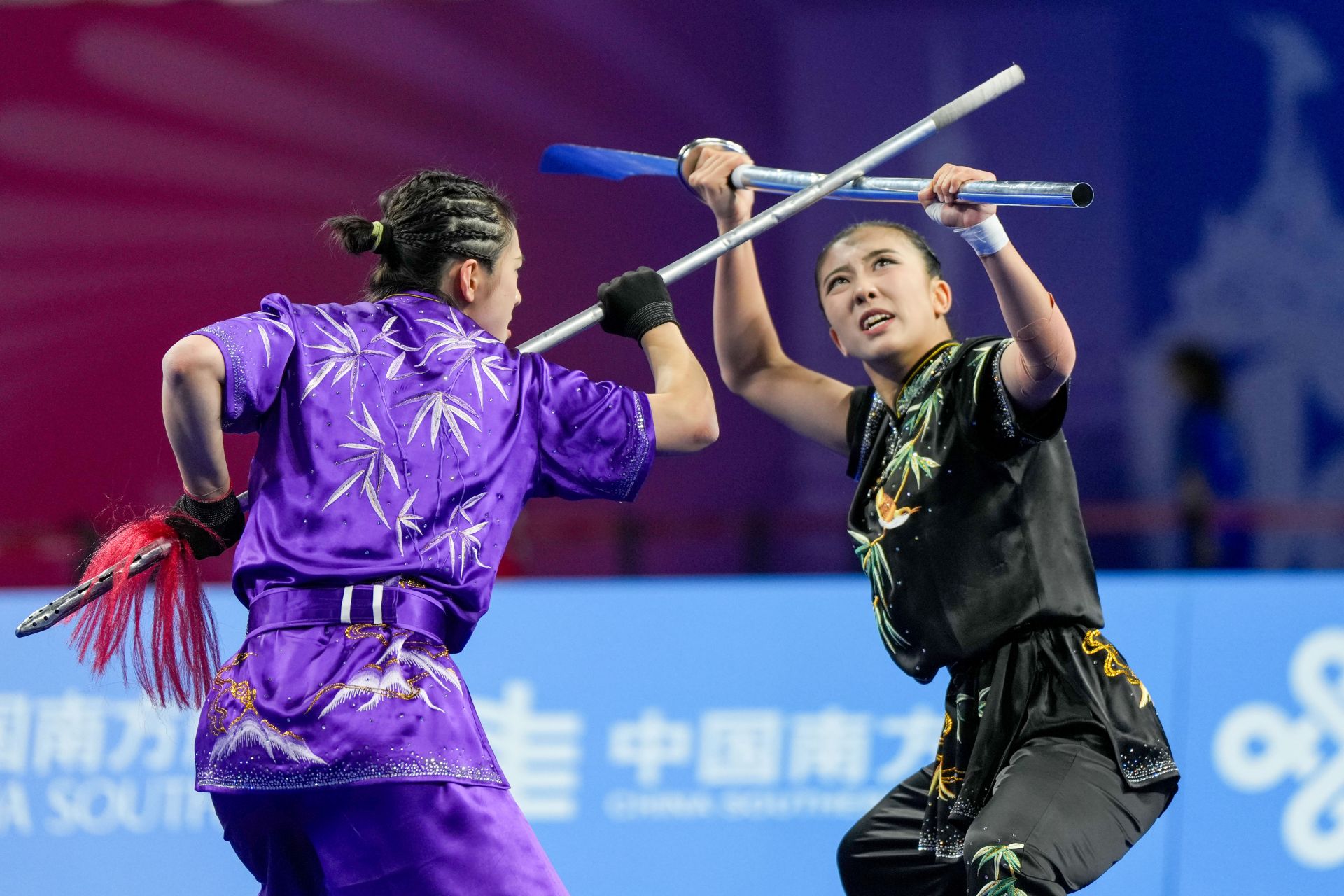 11月10日,山東隊(duì)選手孫守諾、于文珂在團(tuán)體賽女子二人器械(含徒手與器械)對(duì)練比賽中。最終,山東隊(duì)奪得金牌。