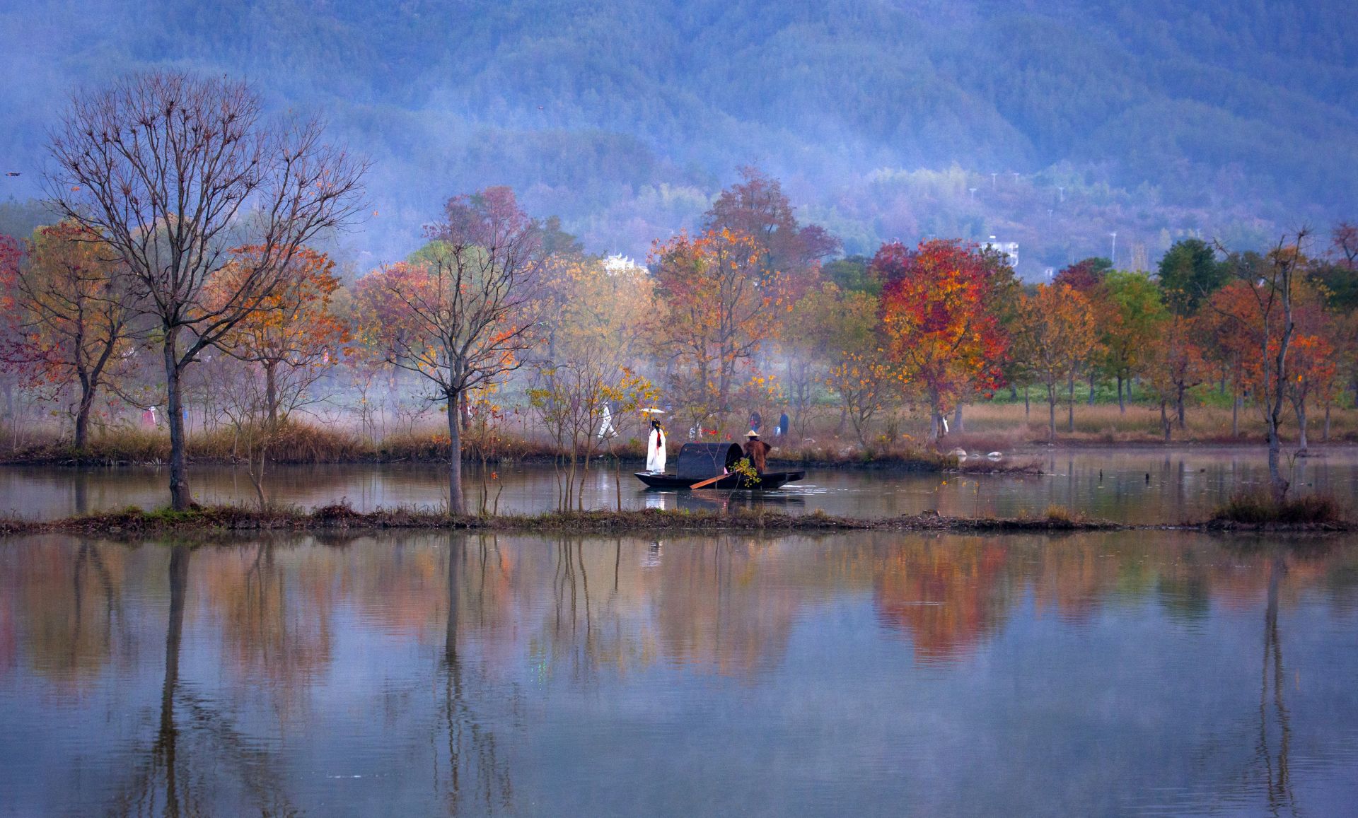 11月12日,在湖北省黃岡市羅田縣九資河鎮(zhèn)河西畈村,游客乘坐小木船觀賞紅葉。