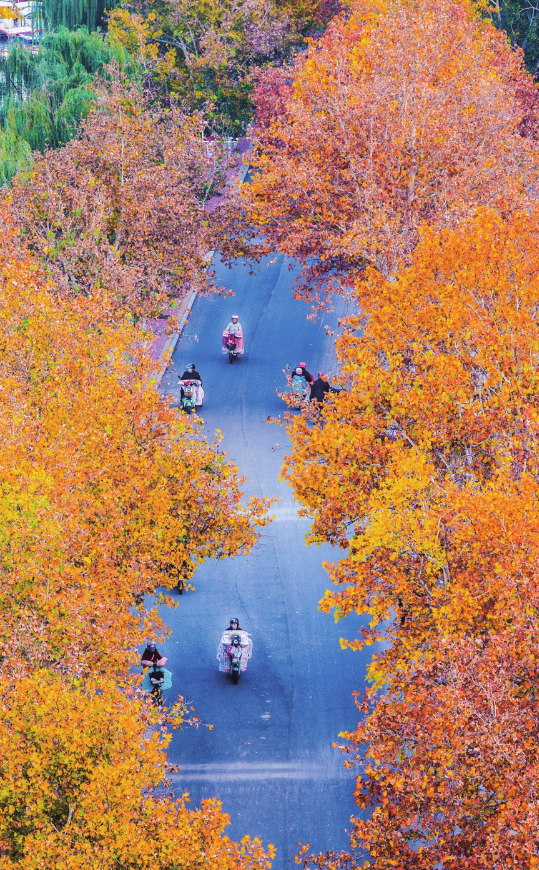 城市的街巷間,又是另一番景象。騎行者們悠然穿梭,頭頂是街邊樹木編織的金色穹頂。陽光透過葉隙灑下斑駁的光點,車輪碾過落葉,發(fā)出沙沙輕響,讓人盡情享受這份難得的都市愜意與自由。
