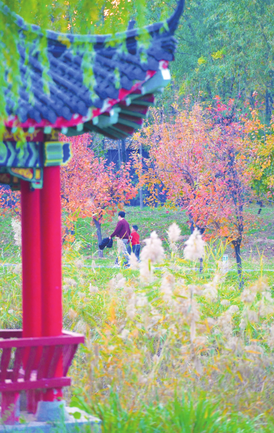 此時的長河公園,迎來了一年中最富層次的時節(jié)。放眼望去,層林盡染,流金疊彩。高大的懸鈴木、挺拔的銀杏,葉片或金黃奪目,或深紅似火,與常綠樹種交織出一幅流動的畫卷。清晨與傍晚,這里便成為市民娛樂健身的首選之地。